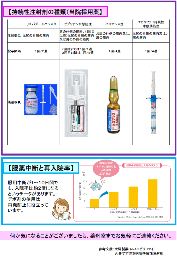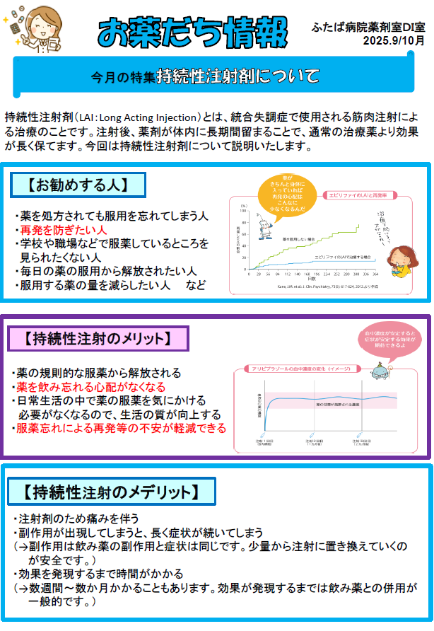 ふたば病院薬剤室にて発行している「お薬だち情報」の最新版が発行されました。今回の特集は「持続性注射剤について」です。