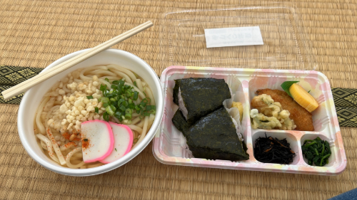 1演目無事終了〜、という事でお弁当とうどんのいつもの「炭水化物は正義!」セット。