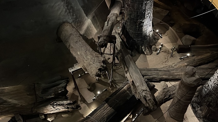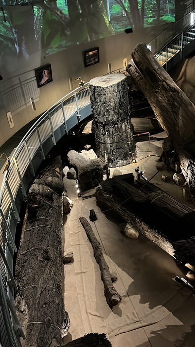 地下の巨大な空間に埋没林の木がたくさんありました。