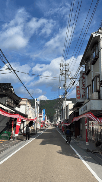 橋を渡った川の反対側が東城のメインストリート、歴史を感じさせる古い町並みです。