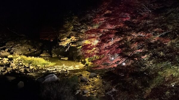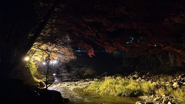 体力回復したところで朝も行った奥津渓がライトアップしているという事でてくてく。