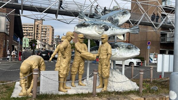 後はこのモニュメントのフグの袋セリの開始とかもニュースで見ます。