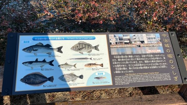 まずは今治城と参りましょ〜、海が近いだけあってお掘りには海の魚もいるそうですよ。