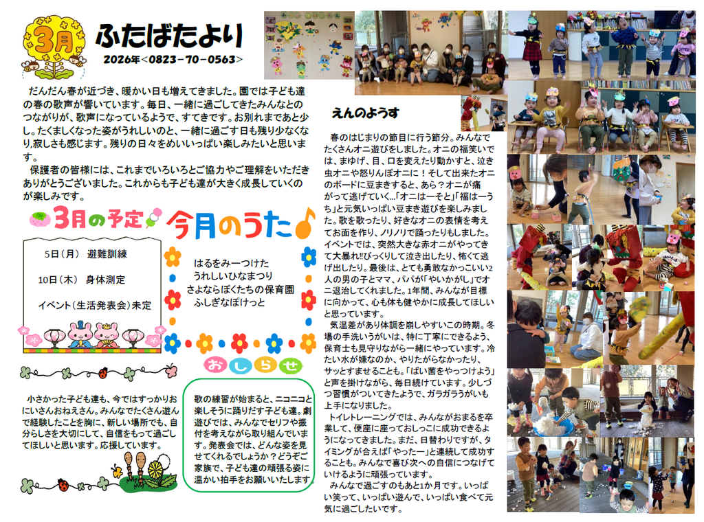 関連保育施設より「ふたばたより」の03月号がとどきました。春は卒業とお別れの季節、いろいろな経験を経てこれからも子供達は成長していくんでしょうねぇ。