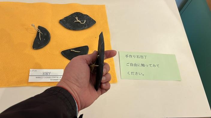 お隣では縄文のお米作りの展示、石包丁思ったより切れそうでした。