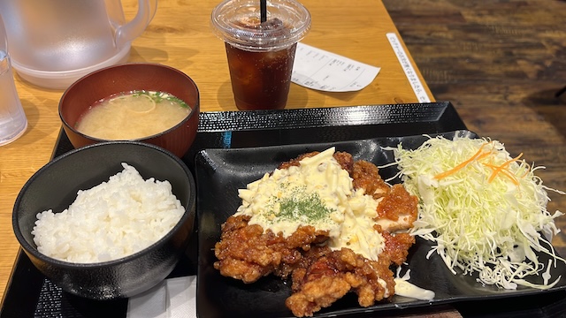 風呂上がりはチキンカツ定食をいただきました。とにかくすごいボリュームです。